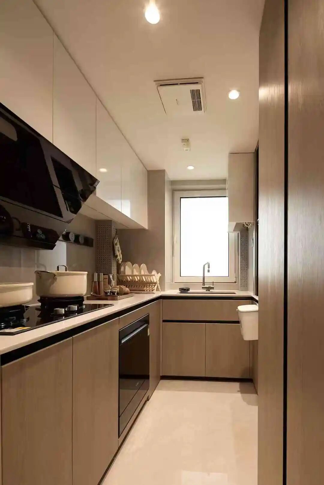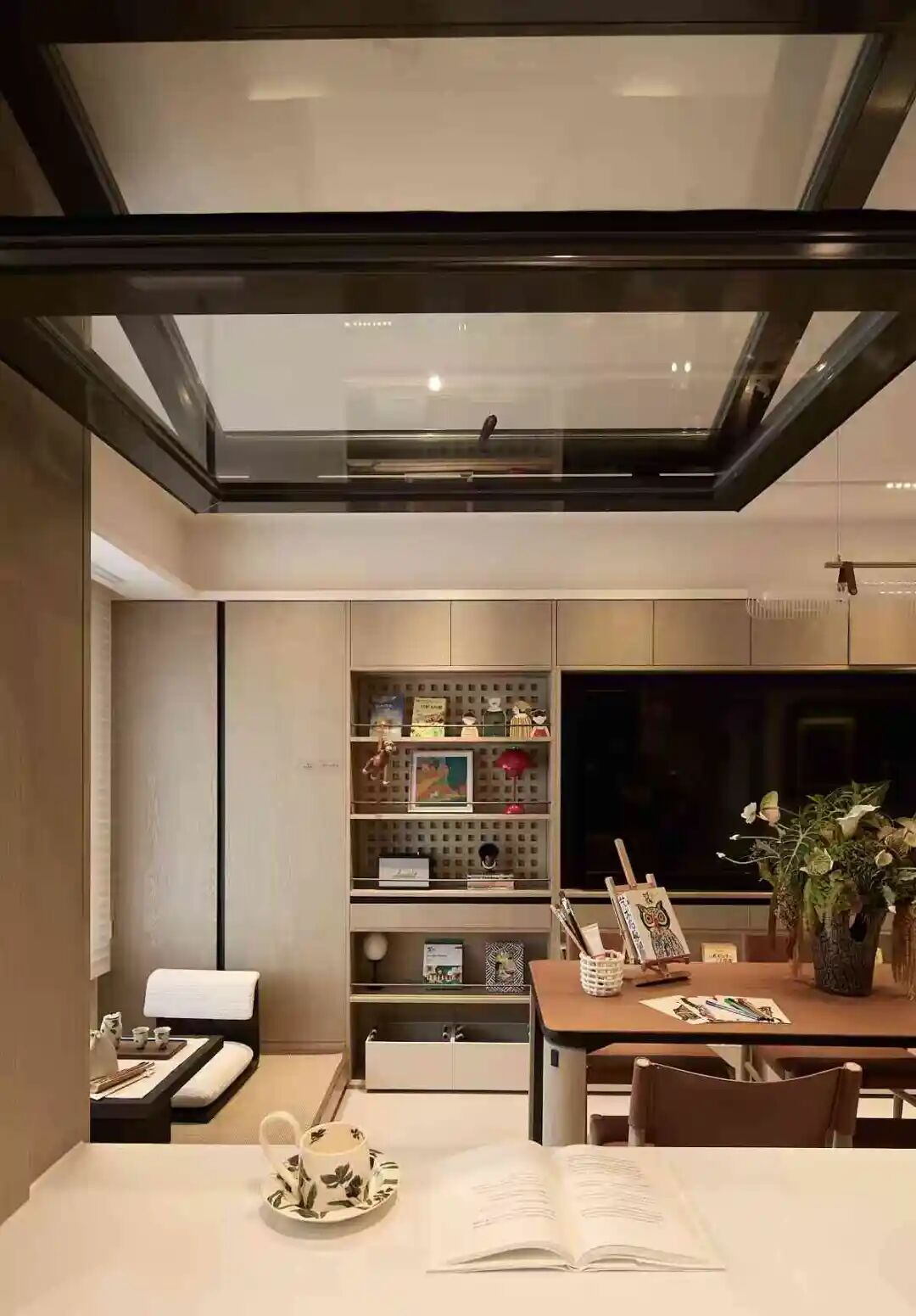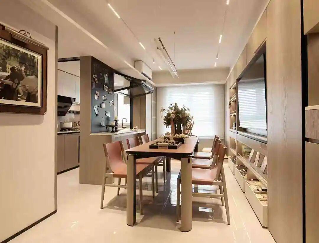 客餐厅之间没有做生硬隔断,而是与其他区域自然连通,厨房与餐厅之间安装的可开可合划轨道玻璃窗,是空间联动与独立的切换键:孩子在餐桌写作业时,家长在厨房忙碌也能随时关注;饭后全家围坐聊天,整个空间通透又温馨,真正实现了“一个空间,多种用法”的灵动价值。