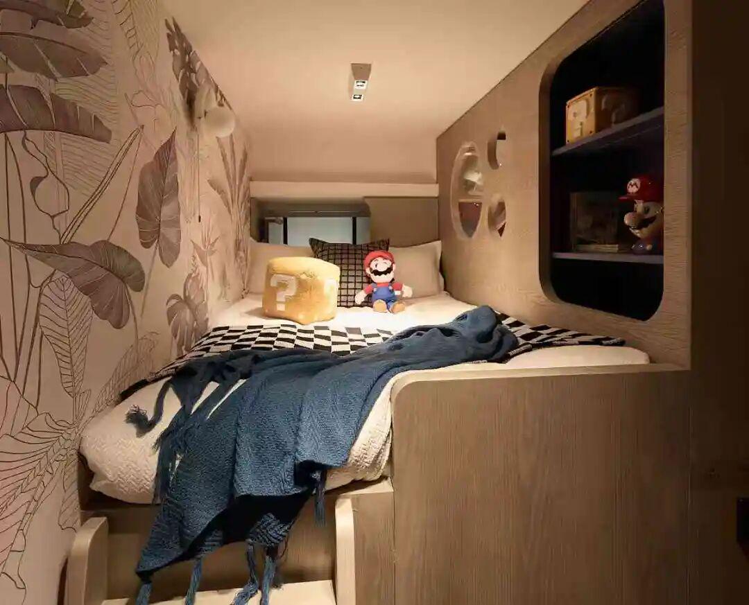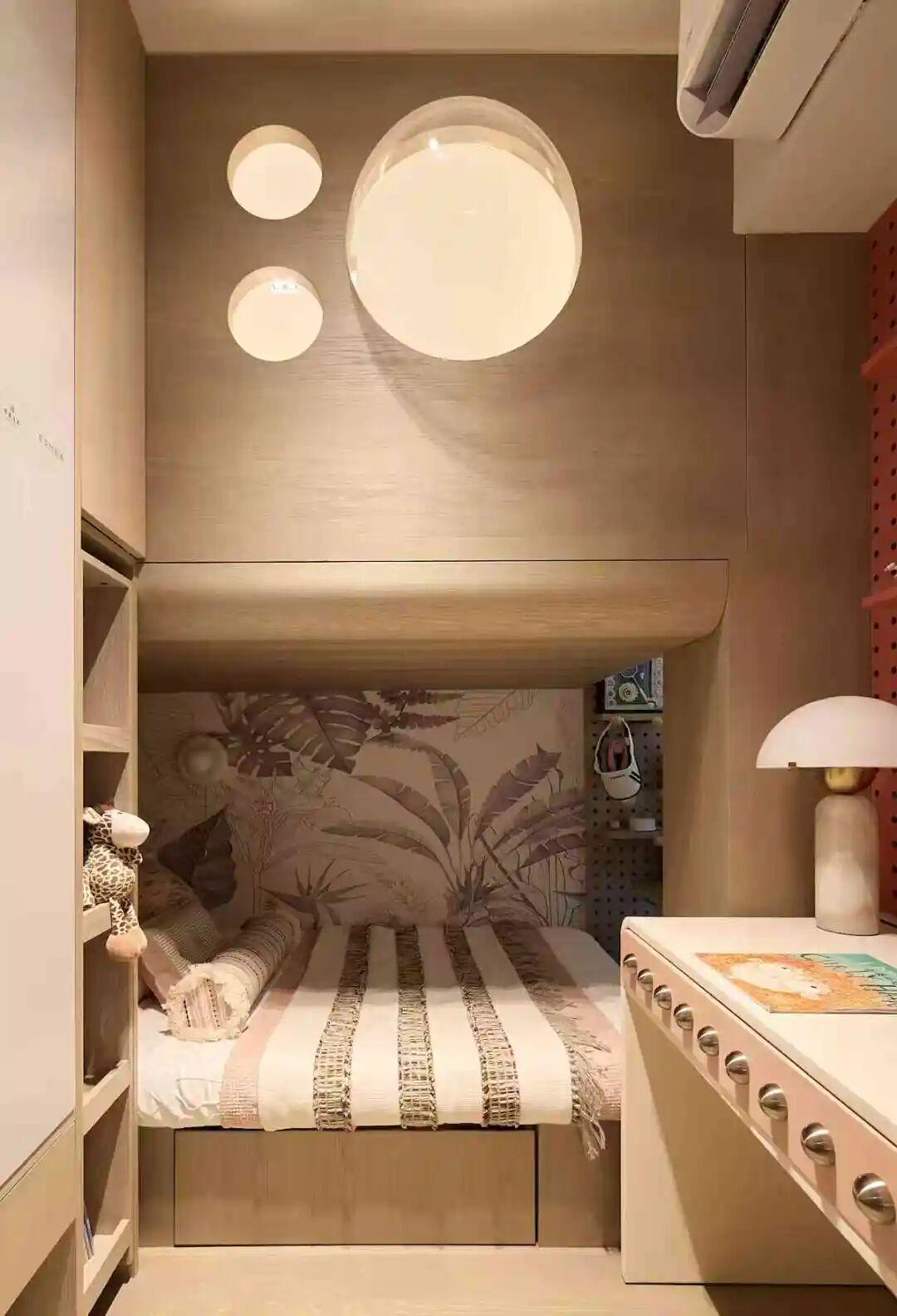 专为两个孩子设计的儿童房,采用上下分层布局,让兄妹各有独立学习空间。更妙的是,两个空间各配一扇折叠门:推开折叠门就能一起玩耍、关上房门便成了独立的“小书房”。这种可开可合的设计,让空间不再是固定的格子,而是能跟着孩子的需求灵活调整,完美解决了多孩家庭“要独立又要互动”的空间矛盾。