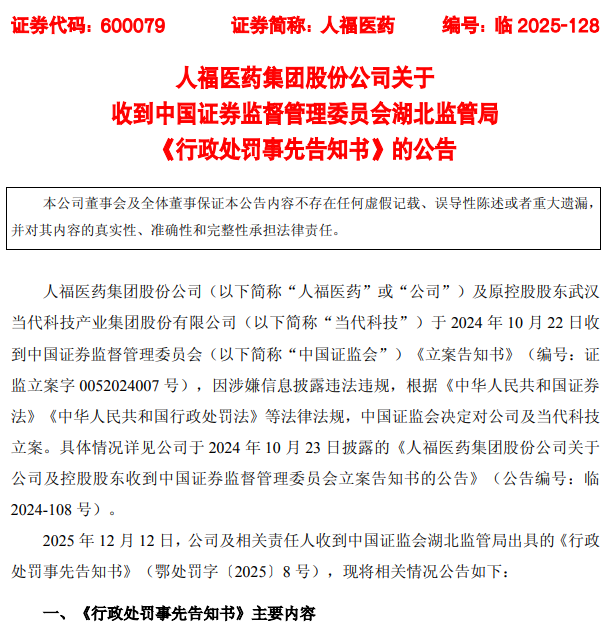 人福医药集团股份公司(以下简称人福医药或上市公司)、武汉当代科技产业集团股份有限公司(以下简称当代集团)涉嫌信息披露违法违规案已由我局调查完毕,我局依法拟对你们作出行政处罚。现将我局拟对你们作出行政处罚所根据的违法事实、理由、依据及你们享有的权利予以告知。
