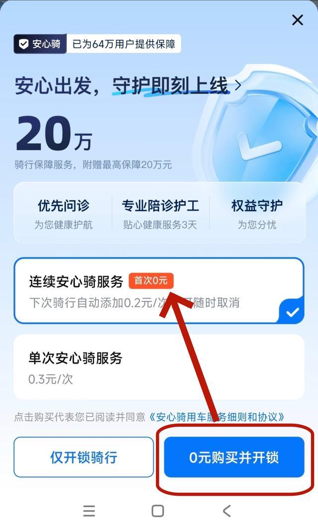 李女士表示:“用APP扫码开锁前,页面上会弹出这个保险的页面,我着急骑车,看着‘0元购买’就点蓝色按钮了。”